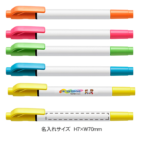 白軸なので会社名やお店のキャラクターを名入れすれば宣伝効果が抜群です。材質/軸・前軸・大小キャップ:再生PP ペン先・中綿:ポリエステル繊維。蛍光ペンは記念品や粗品として配ると喜ばれます。卒業記念品、周年記念品や創立記念品、展示会の来場者記念品にぜひご活用ください。※本体価格にフルカラー印刷代を含んでいる為、定価より高く表示されます。
