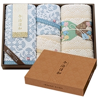 タオルの箱は貝殻模様と唐草模様で彩られた上品な箱に入れてお届けします。セット内容/バスタオル2P:約72×120cm、フェイスタオル2P:約33×75cm。タオルは記念品や粗品として配ると喜ばれます。卒業記念品、周年記念品や創立記念品、展示会の来場者記念品にぜひご活用ください。※この商品はメーカーの希望により販売価格が上代と同じ価格で表示しております。正式お見積りにてお値引を致しますのでご依頼をお待ちしております。
