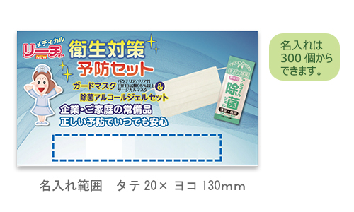 セット内容/サージカルマスク×3、携帯用アルコール除菌ジェル×3。風邪や花粉症予防のグッズは記念品や粗品として配ると喜ばれます。ドラッグストアで配る記念品、周年記念品や創立記念品、展示会の来場者記念品にぜひご活用ください。名入れは300個から可能です。300個以下はできませんのでご了承ください。