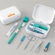 蓋付きのコップに歯ブラシと歯磨き粉をセットしました。コンパクトな大きさなので、バッグに入れて食事後のエチケットにも。