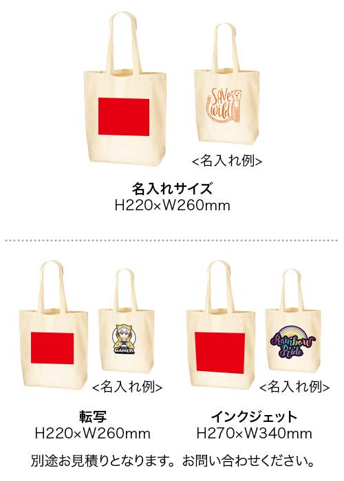 農薬を使用せずに栽培されたオーガニックコットンを使用しているので、環境問題への取り組みのアピールにも繋がります。容量:約14L。転写印刷やフルカラー印刷が可能です。別途お見積もりをいたしますので、お問い合わせください。トートバッグは記念品や粗品として配ると喜ばれます。スーパーで配る記念品、お買い物記念品、創立記念品、展示会の来場者記念品にぜひご活用ください。