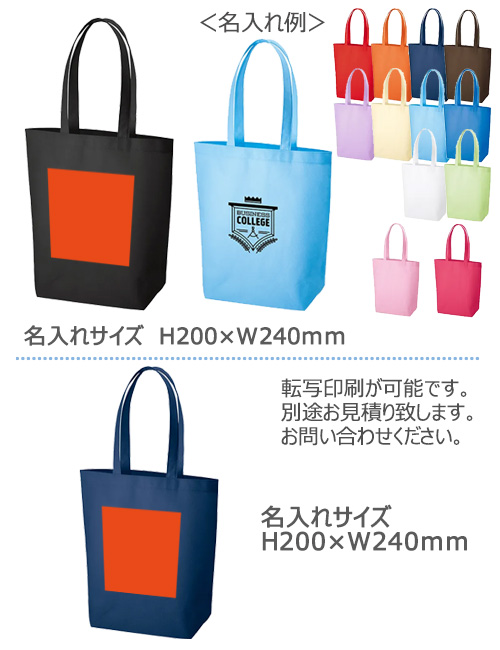 ハンドルの長さは長めに設定されており、肩掛けがしやすいデザインです。カラーはレッド、オレンジ、ディープブルー、ブラウン、ナイトブラック、パープル、ベージュ、ピーチピンク、フロスティブルー、スカイブルー、ビビッドピンク、ナチュラルホワイト、ライトグリーンから選択可能です。容量:約10L。転写印刷が可能です。別途お見積もりをいたしますので、お問い合わせください。トートバッグは記念品や粗品として配ると喜ばれます。インテリアショップで配る記念品、お買い物記念品、創立記念品、展示会の来場者記念品にぜひご活用ください。